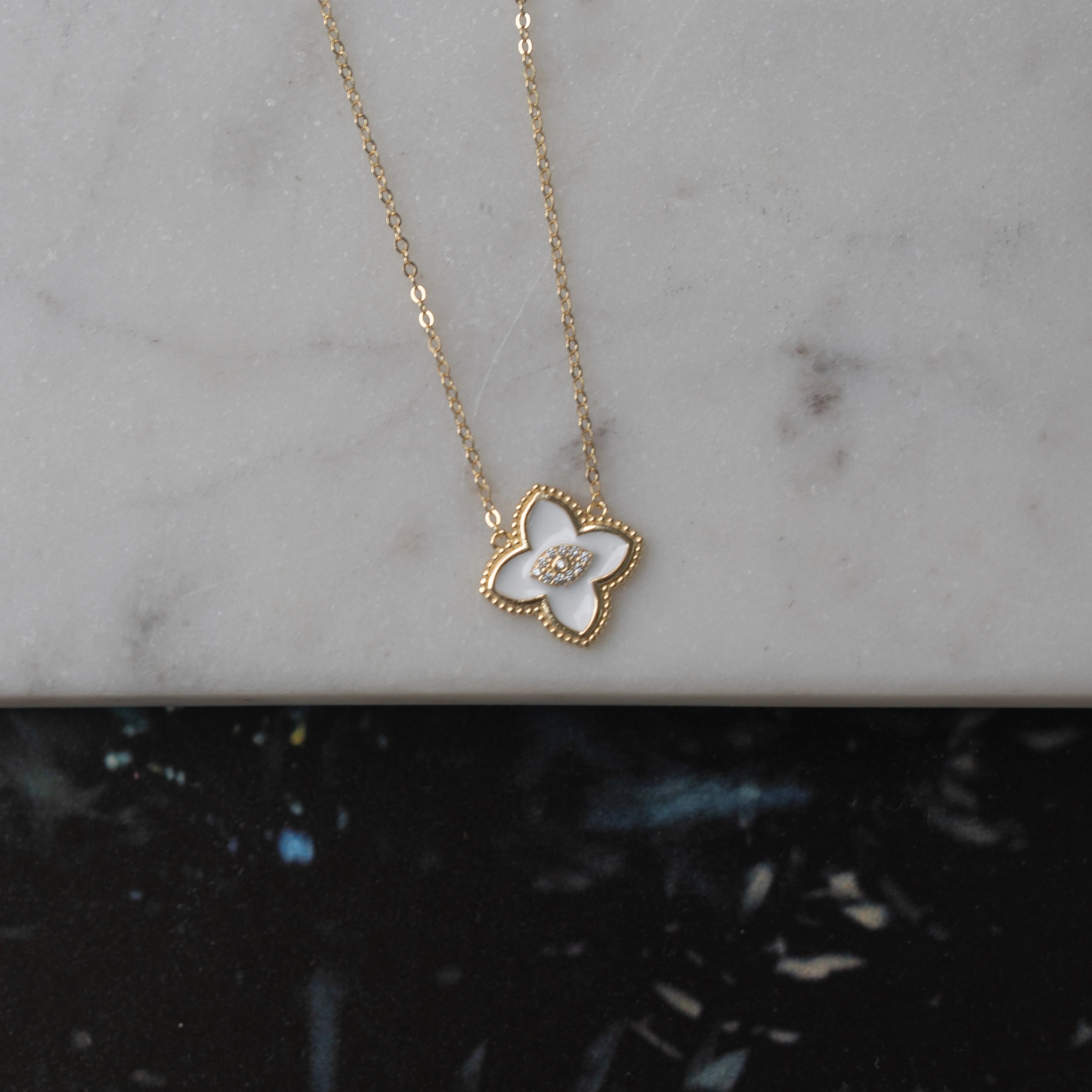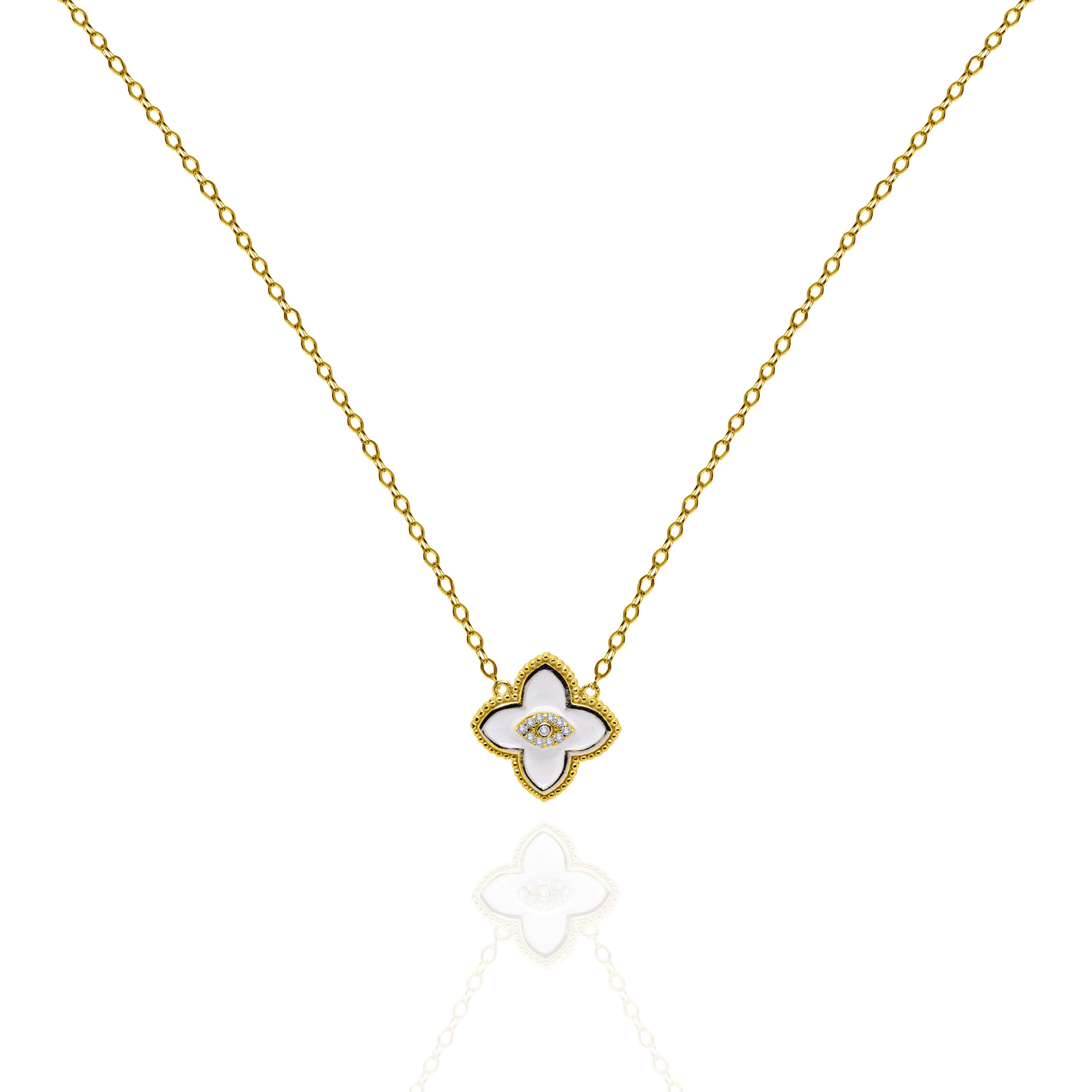 Sterling Silver Gold Vermeil Enamel CZ Evil Eye Clover Necklace, White